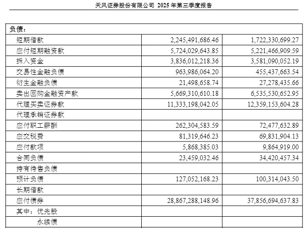天风证券2025年三季报的合并资产负债表显示,截至报告期末,天风证券应付债券账面金额为288.67亿元,较2024年末的378.57亿元的规模有所减少。